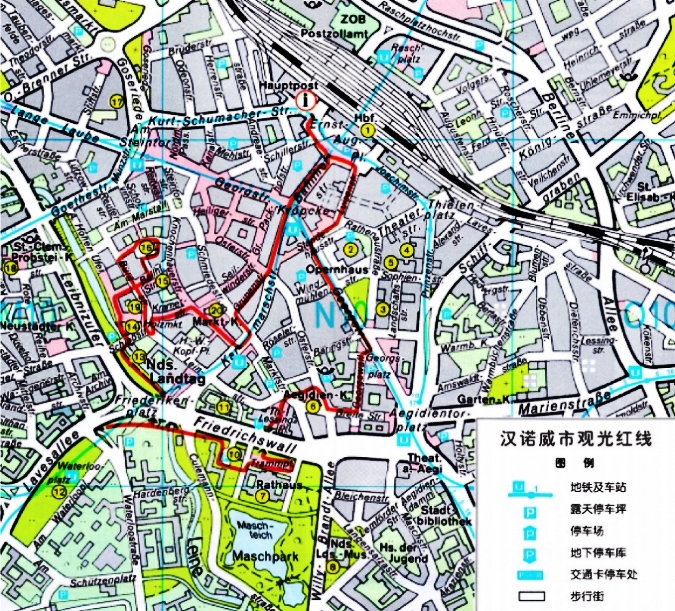 漢諾威市中心最重要的36個景點被一條“紅線”串聯(lián)起來,這是一條畫在地面上紅色的環(huán)線,總長4.2千米。